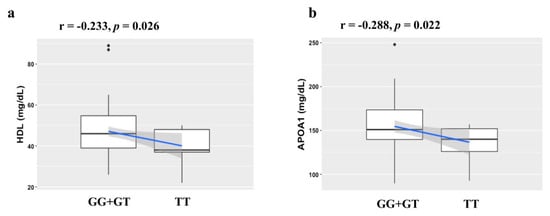 This relationship between HDL and APOA1 levels and the APOA2 rs3813627 SNP was also evaluated through Pearson′s correlation analysis in the overweight/obese individuals using rs3813627 recessive model (GG + GT and TT). Under recessive model, the APOA2 rs3813627 variant was significantly correlated with HDL (r = −0.233 and p = 0.026) and APOA1 (r = −0.284 and p = 0.022) levels under a negative correlation (Figure 2a,b).