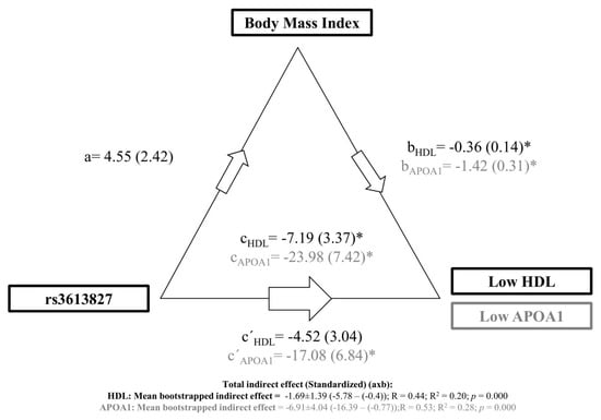 On the other hand, BMI was negatively associated with low APOA1 levels (b, as direct effect of BMI on APOA1 levels: bAPOA1 = −1.42 ± 0.31, p = 0.000). The total effect of the APOA2 rs3813627 SNP through BMI on low APOA1 levels was significantly associated (c, as total effect of rs3813627 on APOA1 through BMI: cAPOA1 = −23.98 ± 7.42, p = 0.002). Moreover, rs3813627 was significantly associated with low APOA1 levels without the effect of the BMI (c´, as direct effect of rs3813627 on APOA1 removing BMI: c´APOA1 = −17.08 ± 6.84, p = 0.014). Summarizing these results, the analyses revealed a significant mediating effect with BMI as mediator, and APOA2 rs3813627 SNP as predictor on the APOA1 levels (28% of the mediation effect, index = −6.91 ± 4.04 (CI: −16.39–(−0.77)), p = 0.000). The effect was considered a partial mediation, since the direct effect of the APOA2 rs3813627 risk genotype on HDL was significant (see c´) in the absence of the mediator.
