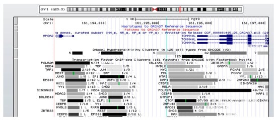 The predicted function of the rs3813627 APOA2 SNP was examined by RegulomeDB, HaploReg, rSNPBase, SNP Function Prediction (FuncPred), PROMO software and PhenoScanner [,,,,,]. RegulomeDB is a database that includes relevant information about SNPs. This information shows predicted regulatory elements, DNase hypersensitivity, binding sites of transcription factors, and promoter regions. These SNP annotations are provided from gene expression omnibus (GEO), the encyclopedia of DNA element (ENCODE) project, and other published literatures. HaploReg is a tool for exploring variants associated with a phenotype, using linkage disequilibrium (LD) information, effect of regulatory motif and expression quantitative trait loci (eQTL) studies, and others. rSNPBase is a database of curated regulatory SNPs. FuncPred was used to study the regulatory potential of SNPs. This tool uses the TRANSFAC database on potential transcription factor recognition sites. We have also examined the association between the rs3813627 APOA2 SNP and the expression levels of APOA2 in many human tissues in the genotype tissue expression (GTEx) portal. PhenoScanner is a curated database holding publicly available results from large-scale genome-wide association studies. This database provides relationships between genetic variants with a broad range of phenotypes, as gene expression.