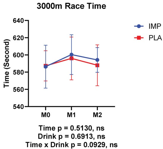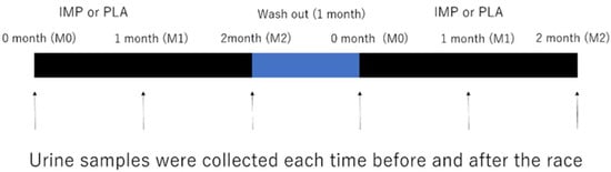 The subjects carried out 3000 m TTs at time point of M0, M1, and M2. The time trials were carried out on an athletic field. The food and fluid intake of subjects was not restricted on the days of the races (Figure 1). IMP or PLA were consumed over 2 months, separated by a 1-month wash-out period, according to previous studies [,,]. Ratings of perceived exertion (RPE) were obtained using the Borg scale. Body composition and body fat percentage were obtained using an InBody 720 Body Composition Analyzer (Inbody Japan Inc., Tokyo, Japan). Participants were asked to self-report if they experienced discomfort during the experiment period.