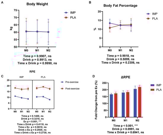 Body composition, body fat percentage, and ratings of perceived exertion (RPE) results. (A) Body weight change, (B) change in body fat percentage, (C) RPE at each time point, and (D) RPE change between IMP and PLA. The data are presented as means ± SD. *** p < 0.001.