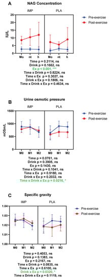Results of renal function. (A) N-acetyl-β-d-glucosaminidase (NAG) concentration, (B) urine osmotic pressure, and (C) urine-specific gravity. The data are presented as means ± SD. * p < 0.05, and *** p < 0.001. Green text indicates a significance <0.05