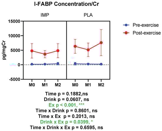 Urine intestinal fatty acid binding protein (I-FABP) concentration corrected with creatinine. The data are presented as means ± SD. * p < 0.05 and *** p < 0.001. Green text indicates a significance <0.05.