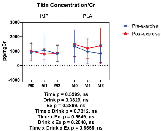 Titin was measured as a muscle damage marker, which was not altered by 3000 m TTs. IMP did not alter titin concentration (Figure 6). Summary data are available in Table 1.