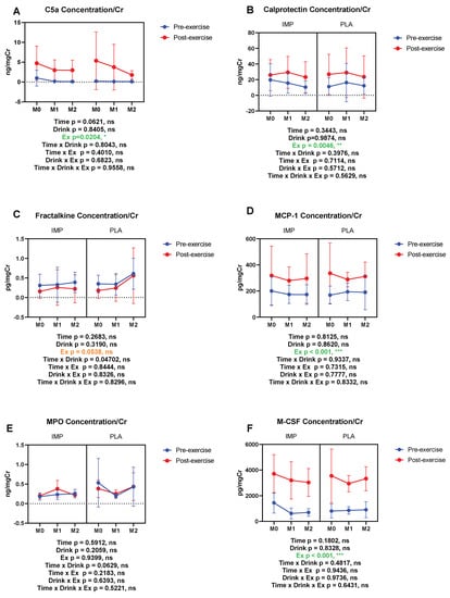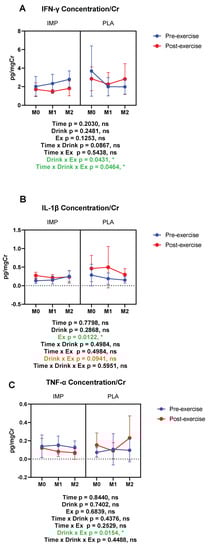 The inflammatory markers IFN-γ, IL-1β, TNF-α, C5a, calprotectin, fractalkine, MCP-1, MPO, and M-CSF were measured in subjects’ urine. In the placebo period, IFN-γ, IL-1β, and TNF-α tended to increase after exercise. However, in the IMP supplementation period, the exercise-induced increase of the above cytokines was inhibited (IFN-γ and TNF-α), or trended towards being inhibited (IL-1β), according to interactions between drink and exercise (Figure 7). Summary data are available in Table 1.