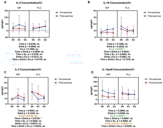 Urine IL-4 (A), IL-10 (B), IL-2 (C), and IL-12p40 (D) concentrations corrected with creatinine. The data are presented as means ± SD. * p < 0.05. Green text indicates a significance < 0.05 and orange text indicates a significance <0.10.