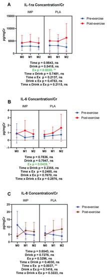 Urine IL-1 receptor antagonist (ra) (A), IL-6 (B), and IL-8 (C) concentrations corrected with creatinine. The data are presented as means ± SD. * p < 0.05 and ** p < 0.01. Green text indicates a significance < 0.05.