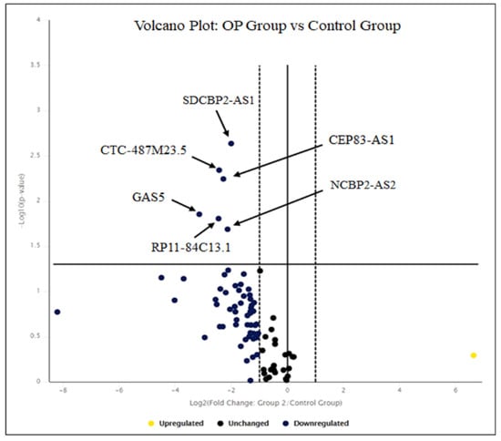 Volcano plot of LncRNAs levels in OP vs. CTRs. The Volcano plot shows the significant lncRNAs that we found down-regulated in osteoblast cell lines on the left (down-regulated) and above the solid vertical line (statistically significant), according to significant p-value and fold-regulation change. The solid vertical line represents no change in gene expression (log2 (1) = 0). The dotted lines represent a selected threshold or boundary for fold change. The default setting is 2. The solid vertical line represents a selected threshold for the p-value and statistical significance. The default setting is 0.05. Statistical significance versus fold-change is shown on the y- and x-axes, respectively [].