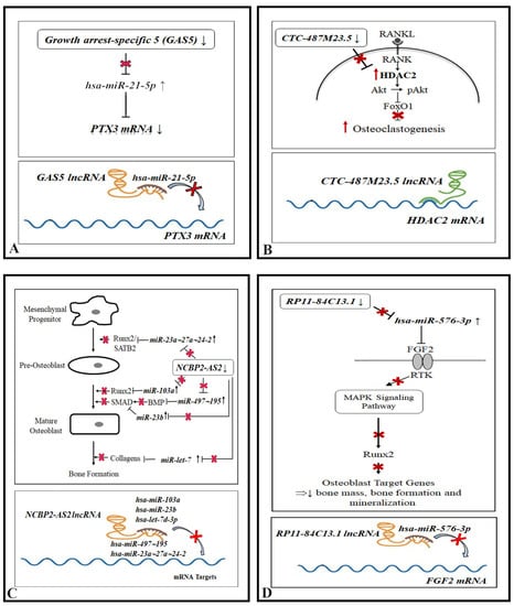 Hypothetical pathogenetic mechanisms emerging from this study. (A) Growth arrest-specific 5 (GAS5) lncRNA masks miR-21-5p binding sites, (B) CTC-487M23.5 lncRNA inhibits the translation of HDAC2 mRNA, (C) NCPB2-AS2 lncRNA masks miRNA binding sites implicated in osteoblast differentiation, and (D) RP11-84C13.1 lncRNA masks miR-576-3p binding sites. ↑ and ↑: increase; ↓: decrease;