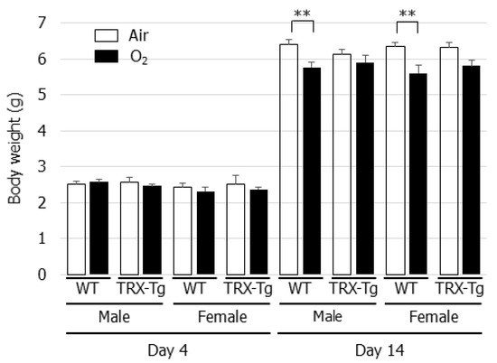 Changes in body weight after neonatal hyperoxic exposure. The changes in body weight were evaluated in 4 and 14-day-old WT and TRX-Tg mice following normoxic or hyperoxic exposure (n = 6 per group). Data are shown as means ± SEM. Comparisons between groups were performed using one-way ANOVA followed by Tukey’s test. ** p < 0.01. WT: wildtype; TRX: Thioredoxin-1; Tg: Transgenic; Air: Normoxia; O2: Hyperoxia; SEM: Standard error of the mean; ANOV: Analysis of variance.