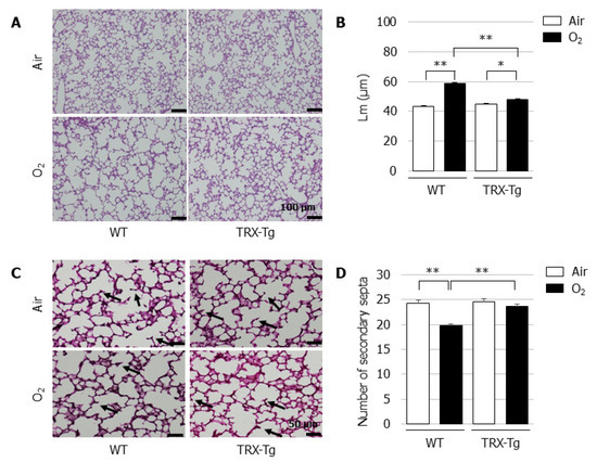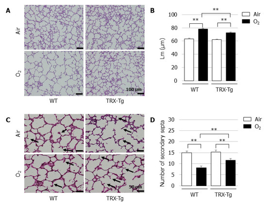 In normal room air, the mice developed well-organized terminal airways. In contrast, the exposure of newborn mice to hyperoxia for 96 h led to the impairment of alveolar development, resulting in alveolar expansion and simplification (Figure 2A). Compared with the normoxic control lungs, a longer Lm was observed after neonatal hyperoxic exposure in the lungs of both the WT and TRX-Tg mice on day four (Figure 2B). Neonatal hyperoxia also led to a reduction in the number of secondary septa in the lungs of both the WT and TRX-Tg mice (Figure 2C,D).