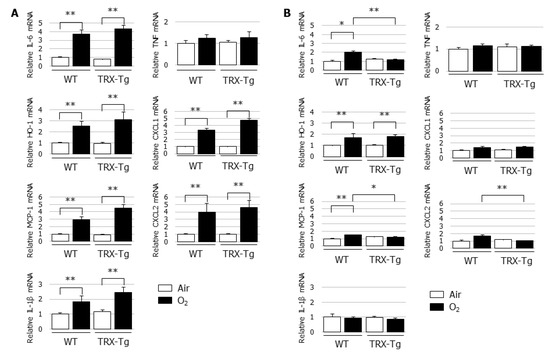 Changes in mRNA expression levels of Il-6, Ho-1, Mcp-1, Il-1β, Tnf, Cxcl1, and Cxcl2 in lungs. Quantitative RT-PCR was performed on (A) day 4 and (B) day 14 (n = 6 per group). Animals were exposed to air (open bars) or O2 (filled bars). Data are shown as means ± SEM. Comparison between groups were performed using one-way ANOVA followed by Tukey’s test. * p < 0.05; ** p < 0.01. IL: Interleukin; HO: Heme oxygenase; MCP-1: Monocyte chemotactic protein-1; TNF: Tumor necrosis factor; CXCL: Chemokine (C-X-C motif) ligand; Air: Normoxia; O2: Hyperoxia; WT: Wildtype; TRX: Thioredoxin-1; Tg: Transgenic; SEM: Standard error of the mean; ANOVA: Analysis of variance.