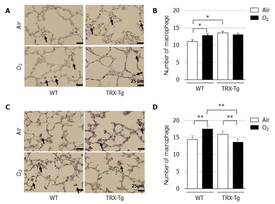 3.5. Macrophage Infiltration Is Reduced in the Lungs of TRX-Tg Mice after Neonatal Hyperoxia