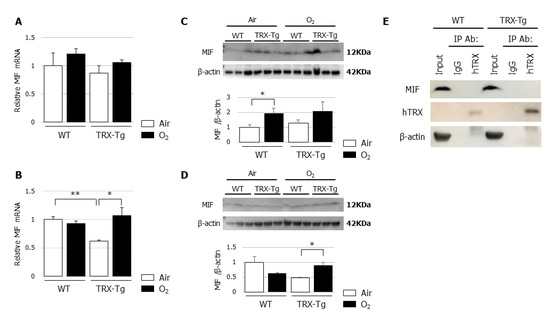 (A,B) Mif mRNA expression levels. Quantitative RT-PCR for MIF was performed on (A) day 4 and (B) day 14 (n = 6 per group). (C,D) MIF protein expression levels. Western blot analysis for MIF was performed on (C) day 4 and (D) day 14. Animals were exposed to air (open bars) or O2 (filled bars). Data are shown as means ± SEM. Comparisons between groups were performed using one-way ANOVA followed by Tukey’s test. * p < 0.05. Air: Normoxia; O2: Hyperoxia; MIF: Macrophage migration inhibitory factor; WT: Wildtype; TRX: Thioredoxin-1; Tg: Transgenic; SEM: Standard error of the mean; ANOVA: Analysis of variance. (E) Immunoprecipitation of TRX with MIF. Immunoprecipitation using normal IgG and anti-TRX antibody was analyzed by Western blot analysis. The antibodies for Western blotting were anti-MIF, anti-hTRX, and anti-β-actin. hTRX: Human thioredoxin; MIF: Macrophage migration inhibitory factor.