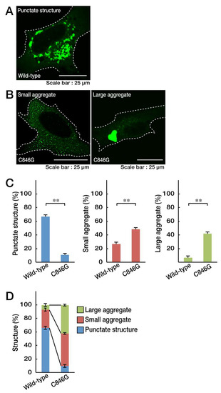 The Cys846-to-Gly (C846G) mutant proteins of vacuolar protein sorting-associated protein 11 homolog (VPS11) are present in small aggregates and large aggregates. A. FBD-102b cells were transfected with the plasmid encoding wild-type VPS11 with a GFP tag and were obtained as representative fluorescence images of punctate structures (green). B. Cells were transfected with the plasmid encoding the C846G mutant of VPS11 and were obtained as representative fluorescence images of small aggregates and large aggregates. C. The graph on the left shows the percentages of cells containing punctate structures (**, p < 0.01 in Student’s t-test; n = 3 fields [total 240 cells]). The graphs in the middle and on the right show the percentages of cells containing small aggregates and large aggregates (**, p < 0.01 in Student’s t-test; n = 3 fields [total 240 cells]). D. The percentages of cells with the respective structures are also shown in a graph.