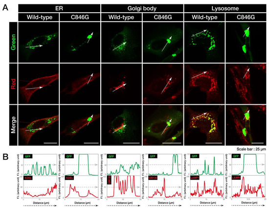 First, to investigate where wild-type or C846G VPS11 proteins are localized in cells, we co-stained VPS11 proteins with the respective antibodies against the endoplasmic reticulum (ER), Golgi body, and lysosome (Figure 2A). Wild-type VPS11 proteins were co-stained with neither the ER marker KDEL, nor the Golgi body marker Golgi matrix protein of 130 kDa (GM130). They were co-stained with the lysosome marker lysosomal-associated membrane protein 1 (LAMP1). Co-localization of wild-type VPS11 proteins and LAMP1 is also shown as similar plot profiles in the line plot (Figure 2B), which is consistent with the established results that VPS11 acts in lysosomes and organelles around lysosomes [10]. The C846G mutant proteins were co-stained with neither KDEL nor GM130. In addition, they were not co-stained with LAMP1. In contrast, wild-type VPS11 proteins were present in both early endosome marker early endosome antigen 1 (EEA1)- and late endosome marker Rab7-stained vesicles. On the other hand, the C846G mutant proteins were not in either vesicles (Figure S1), suggesting that mutant proteins are not present in early and late endosomes but in other organelles and/or as the other structures.