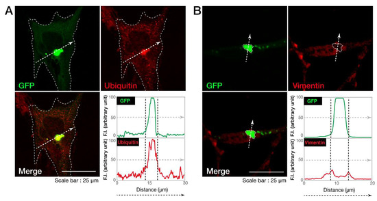 The C846G mutant proteins of VPS11 are positive with ubiquitin and surrounded by vimentin. A and B. FBD-102b cells were transfected with the plasmid encoding the C846G mutant of VPS11 (green). Transfected cells were stained with an antibody against ubiquitin or vimentin (red). Merged images with the dotted arrows are also shown in the bottom panels. Fluorescence intensities (F.I., arbitrary unit) of green and red are shown along the dotted arrows.