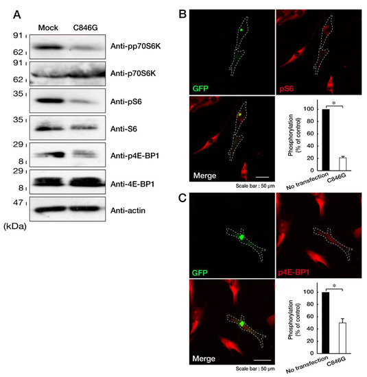 3.2. Expression of the C846G Mutant Proteins in Cells Leads to Downregulation of p70S6K Signaling