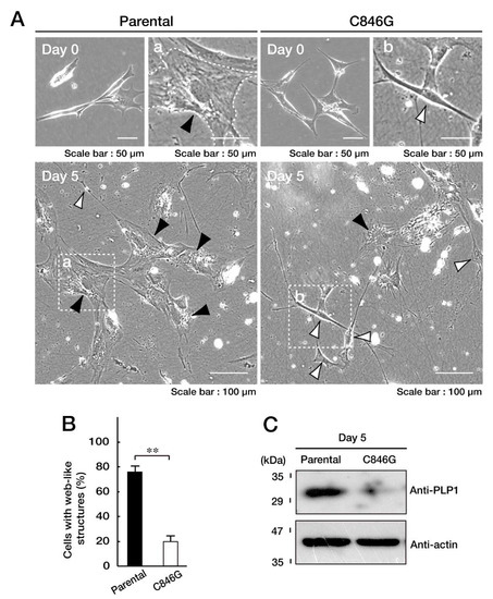 Although we tried to isolate the single cell-derived colonies following genome editing in the FBD-102b cells, we achieved neither colony isolation nor genome editing. Thus, we collected FBD-102b cells stably harboring the C846G mutant constructs and used them for experiments in cell differentiation (Figure S2). Cells were allowed to differentiate for 5 days. Before the induction of differentiation, FBD-102b cells exhibited spindle-like phenotypes with some processes. Following the induction of differentiation, FBD-102b cells exhibited phenotypes with large web-like structures along processes [26,27], and the transcription of myelin marker molecules such as myelin proteolipid protein 1 (PLP1) and myelin basic protein (MBP) (Figure S3), as seen in primary oligodendroglial cells [3,4,26,27]. C846G mutant clones failed to exhibit differentiated phenotypes, whereas parental cells did at a rate of approximately 70% (Figure 5A,B). Consistent with these results, stable clones exhibited decreased levels of markers such as PLP1 (Figure 5C). Together, it is thought that the C846G mutation of VPS11 leads to inhibition of FBD-102b cell differentiation.
