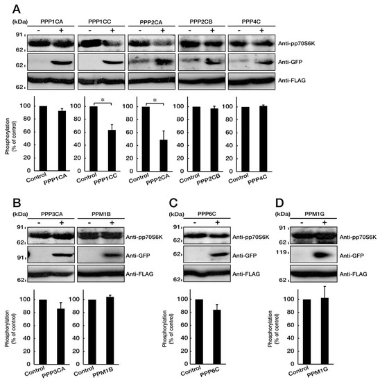 PP1C and PP2A are p70S6K phosphatases. A–D. COS-7 cells were transfected with mock (-) or the plasmid encoding the respective protein phosphatases (+, GFP-tag) with p70S6K (FLAG-tag). Cells were lysed and immunoblotted with an anti-phosphorylated (p) p70S6K antibody. Expression of GFP-tagged phosphatases and FLAG-tagged p70S6K is also shown. Statistical data for phosphorylated levels of p70S6K are shown in graphs (*, p < 0.05 in students’ t-test; n = 5 blots).