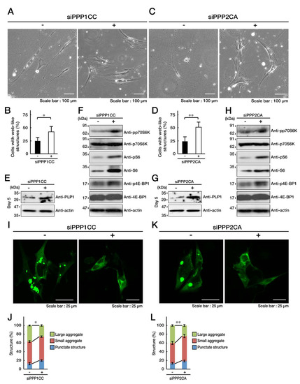 Next, we transfected each of four non-overlapping siRNAs for PPP1CC or PPP2CA into FBD-102b cells, and examined the effect of each siRNA on knockdown for PPP1CC or PPP2CA by RT-PCR (Figure S4). Effective for knockdown are four siRNAs for PPP1CC or three siRNAs for PPP2CA. We selected PPP1CC siRNA starting from the 78th nucleotide or PPP2CA siRNA starting from the 109th nucleotide, and employed them in the following experiments. Knockdown of PPP1CC impaired the C846G mutant-mediated undifferentiated phenotypes by approximately 50% (Figure 7A,B). Similarly, knockdown of PPP2CA impaired the undifferentiated phenotypes (Figure 7C,D). Their impairment was accomplished with expression of PLP1 (Figure 7E,G). Also, knockdown of PPP1CC or PPP2CA reversed phosphorylation levels of p70S6K as well as S6 and 4E-BP1 proteins (Figure 7F,H). In addition, knockdown of PPP1CC or PPP2CA impaired formation of large aggregates (Figure 7I,J; Figure 7K,L).