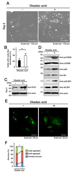 We next explored whether a chemical inhibitor has similar effects as the knockdown experiments of PPP1CC or PPP2CA. We treated cells stably harboring the C846G mutant constructs with Okadaic acid, which is a chemical inhibitor specific for both PP1 and PP2A [30]. Treatment with Okadaic acid impaired their undifferentiated phenotypes by approximately 50% (Figure 8A,B), and promoted PLP1 expression (Figure 8C). Also, it reversed the phosphorylation levels of p70S6K, as well as the S6 and 4E-BP1 proteins (Figure 8D). It is of note that Okadaic acid decreased the formation of large aggregates (Figure 8E,F).
