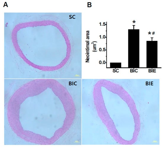 In order to investigate the effect of aerobic exercise on the neointimal formation in the balloon-induced rat model with a high-fat diet, we measured the neointimal formation in the balloon-injured common carotid arteries (CCA) with a high-fat diet (Figure 2). The neointimal formation was significantly inhibited by the aerobic exercise training compared to the BIC group (p < 0.05, 1.31 ± 0.15 vs. 0.85 ± 0.12).