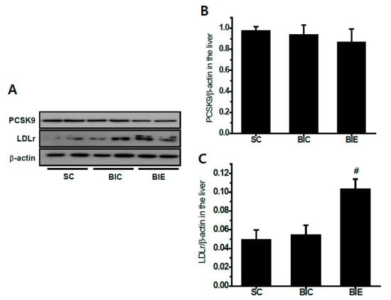 We measured the hepatic PCSK9 and LDLr in the livers of rats (Figure 3). Aerobic exercise training did not significantly affect the hepatic PCSK9 protein expression. However, the LDLr expression in the liver was significantly increased by aerobic exercise compared with the BIC group (p < 0.05, 0.10 ± 0.02 vs. 0.05 ± 0.01).