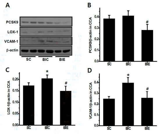 We investigated the expression of PCSK9, LOX-1 and VCAM-1 in the balloon-induced common carotid arteries of rats with a high-fat diet (Figure 4). Aerobic exercise training significantly inhibited the PCSK9 expression in the CCA compared to the SC and BIC group (p < 0.05, 0.38 ± 0.03 and 0.41 ± 0.04 vs. 0.28 ± 0.05). LOX-1 expression in the CCA was significantly increased in the BIC group compared to the SC (p < 0.05, 0.17 ± 0.01 vs. 0.20 ± 0.01). However, aerobic exercise training significantly recovered the increase of balloon-induced LOX-1 expression in the CCA compared to the BIC group (p < 0.05, 0.20 ± 0.01 vs. 0.15 ± 0.02). VCAM-1 expression in the CCA was significantly increased in the BIC compared to the SC (p < 0.05, 0.25 ± 0.02 vs. 0.39 ± 0.05). However, aerobic exercise training significantly recovered the increase of balloon-induced LOX-1 expression in the CCA compared to the BIC group (p < 0.05, 0.39 ± 0.05 vs. 0.26 ± 0.06).