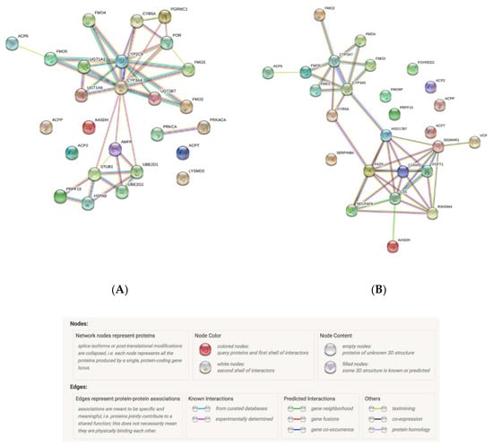 Enzyme activity and functional protein interactions are key to understanding the cellular machinery. In order to fully understand every biological phenomena, it is of importance to study the connectivity of the whole network []. CYP3A enzymes are involved in steroid hormone biosynthesis and in lipid and fatty acid metabolism pathways, while interacting with the main molecules described in Figure 1.