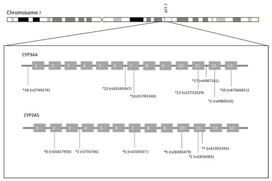 Figure 2 depicts the polymorphic context of CYP3A4 and CYP3A5, with the main polymorphisms described above.