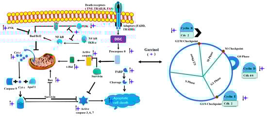 Schematic representation of apoptosis with garcinol treatment (↑ up regulation, ↓ down regulation). Garcinol leads to cell cycle arrest in G0, G1/S, and G2/M phase via regulating binding of CDKs and cyclin molecules (Cyclin B, D and E) respectively. Garcinol leads to apoptosis via PI3K/AKT and NF-κB signaling pathways, PARP cleavage and activation of caspases. Phosphoinositide 3-kinase (PI3K), AKT serine/threonine kinase (Akt), cyclin-dependent kinases (CDKs), poly(ADP-ribose) polymerase (PARP), nuclear factor kappa B (NF-κB), Bcl-2 associated X, apoptosis regulator (Bax), inhibitor of kappa B (IκB-α), Cytochrome c (Cyt c), Cyclin dependent kinase 1 (Cdc2), ppoptotic protease activating factor 1 (Apaf-1), truncated BH3 interacting domain death agonist (tBid), Bcl-2 associated agonist of cell death (Bad), B-cell lymphoma 2 (Bcl-2), c-Jun N-terminal kinase (JNK).