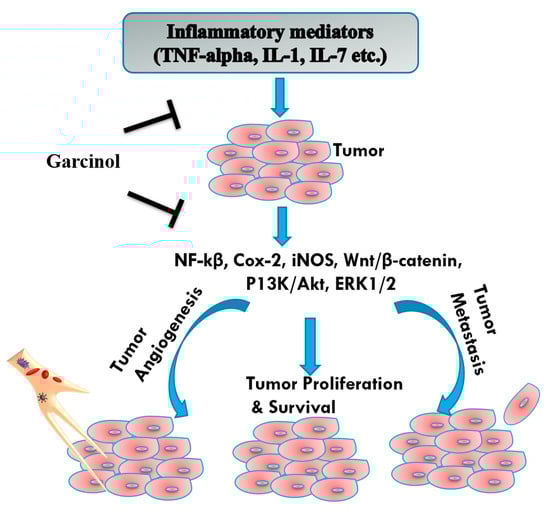 Garcinol mediates anti-inflammatory role in tumor cells via TNF-α, IL-1, and IL-7 which in turn modulates anti-angiogenic and anti-metastatic action in tumor cells is mediated via NF-κB, Cox-2, iNOS, PI3K/AKT, ERK1/2, and Wnt/β-catenin signaling pathways. Tumor necrosis factor-alpha (TNF- α), Interleukin-1 (IL-1), Interleukin-7 (IL-7), Cyclooxygenase-2 (COX-2), inducible nitric oxide synthase (iNOS), nuclear factor kappa B (NF-κB), phosphoinositide 3-kinase (PI3K), AKT serine/threonine kinase (Akt), extracellular signal regulated kinases 1/2 (ERK1/2), wingless (Wnt).