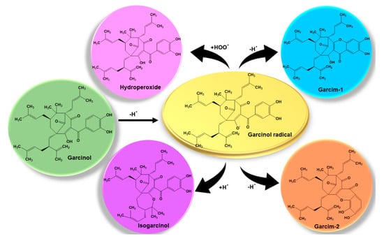 - Sang, S.; Pan, M.-H.; Cheng, X.; Bai, N.; Stark, R.E.; Rosen, R.T.; Lin-Shiau, S.-Y.; Lin, J.-K.; Ho, C.-T. Chemical studies on antioxidant mechanism of garcinol: Analysis of radical reaction products of garcinol and their antitumor activities. Tetrahedron 2001, 57, 9931–9938. [Google Scholar] [CrossRef]