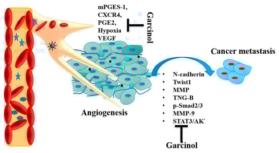 Garcinol, a histone acetyltransferase (HAT) inhibitor, is extensively studied to induce apoptosis and cell cycle arrest in cancer cells. Besides, apoptotic activity garcinol has also been reported to modulate both angiogenesis, as well as metastasis, which are key hallmarks of a cancer cell [,]. The present scientific evidence supporting (Table 1 & Table 2) anti-angiogenic and anti-metastatic potential of garcinol in cancer cells are summarized hereafter.