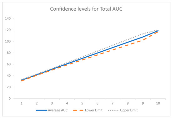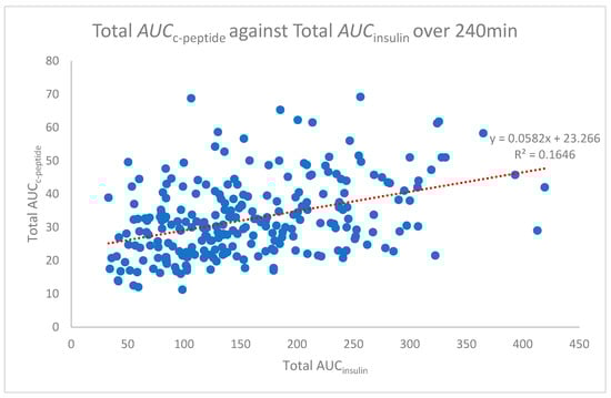 The area under the curve analysis was determined using the trapezoidal rule for each time point for all participants. Pearson’s correlation relating to this data was undertaken to assess the relationship of the area under the curves for insulin and c-peptide. The total area under the curve (Total AUCc-peptide against AUCinsulin) analysis was also conducted. The average total AUC for 240 min of the OGTT is represented in Figure 3. Pearson’s correlation for the total AUC analysis demonstrated only a weak correlation (r = 0.406), though, when 95% confidence intervals were applied to Figure 3, there was little deviation from the average (Figure 4).