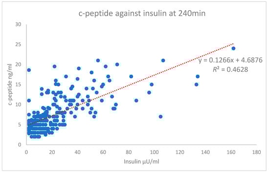 The scatterplot of the independent variables’ c-peptide against insulin at the 240 min time point is shown in Figure 5. The Pearson’s correlation of this time point is on the high end of the moderate correlation with an r value of 0.680 (strong > 0.7). The test results highlight the difference between the Pearson’s correlation of the total AUC r value (0.406), which shows a weak correlation (Figure 3). In comparison, the overall data for each time point (Figure 1) starts with a high-end weak r value (0.482) up to a high-end moderate value (0.680). Only the 240 min time point is shown in Figure 5.