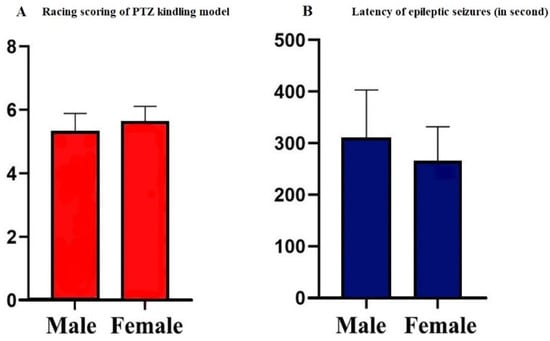 Racing score and seizure latency exhibited by male and female rats after each injection of pentylenetetrazol (PTZ). Values are presented as the mean ± SEM, n = 10 for each group. At the 13th injection, generalized tonic–clonic seizures, corresponding to phase 5 of the Racine’s scaling system score, were observed in both male and female rats (5.31 ± 0.58 and 5.2 ± 0.47) (A). PTZ-kindled female rats had their first seizure in 266 ± 66 s while PTZ-kindled male rats had their first seizure in 308 ± 95 s (B).