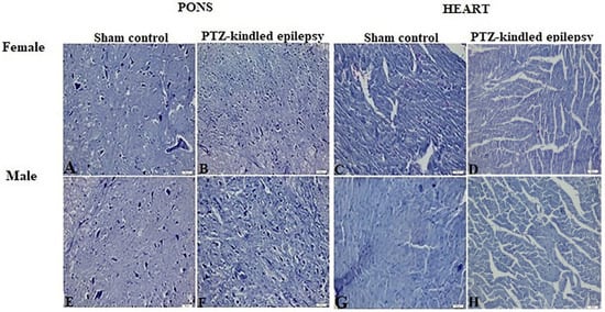 Representative HE staining images of the brainstem (pons) and heart (atria) sections stained with blue in sham control and PTZ-kindled epilepsy of rat model. For female; A: pons image of control groups, B: pons image of PTZ-kindled of epilepsy, C: heart image of control groups, D: heart image of PTZ-kindled epilepsy. For male; E: pons image of control groups, F: pons image of PTZ-kindled of epilepsy, G: heart image of control groups, H: heart image of PTZ-kindled epilepsy. Pictures were taken at the magnification of ×200. Scale bar: 50 μm.