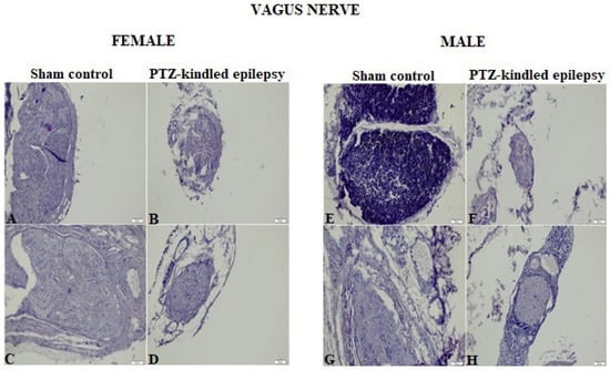 Representative HE staining images of VN sections stained with blue in sham control and PTZ-kindled epilepsy of rat model for male and female rats. For female; A: cervical VN image of control groups, B: thoracic VN image of control groups, C: Cervical VN image of PTZ-kindled epilepsy, D: Thoracic VN image of PTZ-kindled epilepsy. For male; E: cervical VN image of control groups, F: thoracic VN image of control groups, G: Cervical VN image of PTZ-kindled epilepsy, H: Thoracic VN image of PTZ-kindled epilepsy. Pictures were taken at a magnification of ×200. Scale bar: 50 μm.