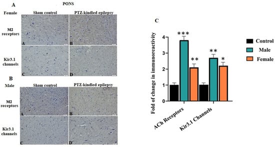 As a result of PTZ kindling, an immune histological staining analysis confirmed that the areas stained with related antibodies, the M2 receptor and Kir3.1 channel, were significantly immunoreactively increased in the pons of the brainstem compared to the normal control (Figure 5A,B). For female PTZ-kindled rats, there was a 2.1-fold change in M2 receptors and 2.2-fold change in Kir3.1 channel when compared to the controls. Moreover, for the male, PTZ-kindled rats, 3.8-fold change in the M2 receptor and 2.7-fold change in Kir3.1 channel were observed when compared to the controls, * p < 0.05, ** p < 0.05, and *** p < 0.05. All these fold changes are demonstrated in Figure 5C. Since the pons is the brainstem region closest to the VN, it has been identified as the main target. Because the activation of the channel and the functional operation of the receptor depend on the ACh neurotransmitter, the increased immunoreactivity of the Kir3.1 channel and M2 receptors in pons tissue indicates the evaluation of parasympathetic centers.