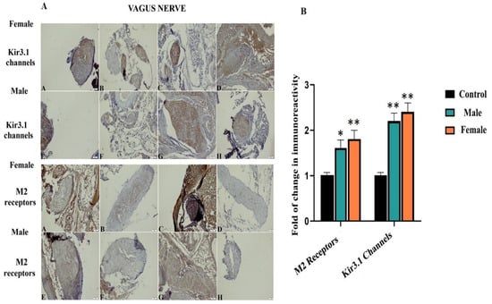 Immunoreactivity results of Kir3.1 channel and M2 receptors in the VN. In both groups, increased immunoreactivity in cervical VN was observed. For female groups; A: Image of cervical VN of control groups, B: Image of thoracic VN of control groups, C: Image of cervical VN of PTZ-kindled epilepsy, D: Image of thoracic VN of PTZ-kindled epilepsy. For male groups; E: Image of cervical VN of control groups, F: Image of thoracic VN of control groups, G: Image of cervical VN of PTZ-kindled epilepsy, H: Image of thoracic VN of PTZ-kindled epilepsy. Pictures were taken at a magnification of ×200. Scale bar: 50 μm (A). Fold change in immunoreactivity for M2 receptors and Kir3.1 channel in the VN (B). For cervical VN, in terms of the immunoreactivity of the M2 receptor, a 1.6-fold change in male and a 1.8-fold change in female rats compared to controls can be seen; for cervical VN, in terms of the immunoreactivity of Kir3.1, a 2.2-fold change in male and a 2.4-fold change in female rats compared to thoracic VN can be seen, * p < 0.05, ** p < 0.01.