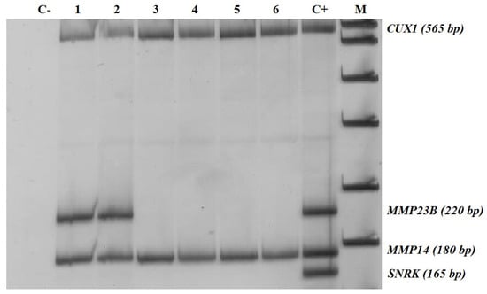 MMP14 and MMP23B simultaneous analysis by methylation-sensitive restriction enzyme digestion PCR (MSRE-PCR). M, DNA ladder pUC19/HpaII; K+, MSRE-PCR products obtained with an undigested human genomic DNA as a template; 1–6, MSRE-PCR products obtained with breast cancer genomic DNA samples digested with HpaII. Positions of the PCR products corresponding to the MMP14 and MMP23B promoter 5′-cytosine-phosphate-guanine-3′ (CpG) islands under analysis, as well as a positive PCR control (a constitutively methylated region of the CUX1 gene), and a DNA digestion control (a constitutively nonmethylated region of SNRK) are specified on the right. MSRE-PCR products from MMP14 are detectable in all the samples, corresponding to constitutively methylated status of its promoter CpG island in all normal and cancerous breast tissues. MMP23B bands are visible only in a K+ sample and in samples 1–2, and are absent in samples 3–6, reflecting differentially methylated status of this fragment. MSRE-PCR does not provide information on the methylation status of individual CpGs contained within the restriction enzyme recognition sequence in an assessed locus. Thus, positive MSRE-PCR signal was interpreted as hypermethylation of the whole target locus, while negative MSRE-PCR signal, as its non-methylated state.
