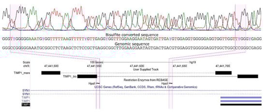 Bisulfite sequence of a fragment of the TIMP1 gene promoter region, validating partially methylated status of CpGs within the HpaII sites assessed by MSRE-PCR in this study. Blue peaks on the sequence correspond to methylated cytosines. HpaII sites are highlighted. TIMP1_msre, an MSRE-PCR product; primers are black rectangles and the insert is a tiny line. TIMP1_bis, a bisulfite PCR product; primers are black rectangles and the insert is a tiny line.