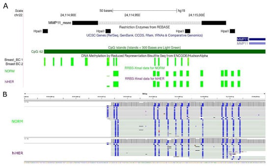 Methylation of a fragment of the MMP11 gene promoter assessed by MSRE-PCR and reduced representation bisulfite sequencing (RRBS). (A) MMP11_msre, an MSRE-PCR product; primers are black rectangles and the insert is a tiny line. Breast_BC1 and Breast_BC2, ENCODE RRBS results: green is for non-methylated CpGs. NORM, XmaI-RRBS results for normal breast tissues. hiHER, XmaI-RRBS results for HER-positive breast tumors of the CpG island hypermethylated subtype. Green is for non-methylated CpGs. (B) Examples of clonal bisulfite sequences obtained by by XmaI-RRBS. NORM, one of the normal breast tissue samples. hiHER, one of the HER-positive breast tumors of the CpG island hypermethylated subtype. Blue is for non-methylated CpGs.