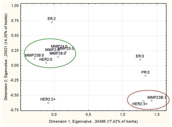 Results of multiple correspondence analysis of HER2 expression status vs. the methylation status of differentially methylated promoter CpG dinucleotides of matrix metalloproteinases genes in breast cancer samples. The non-methylated (designated as “0” at the gene symbol) status of MMP2, MMP23B, MMP24, MMP25, and MMP28 differentially methylated promoter CpG dinucleotides is associated with lack of HER2 expression (green ellipse). The methylated status of MMP23B differentially methylated promoter CpG dinucleotides is associated with a high level (3+) of HER2 expression (red ellipse).