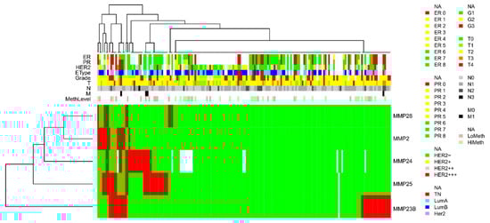 A cluster analysis was carried out on the methylation data of MMP2, MMP23B, MMP24, MMP25, and MMP28 differentially methylated promoter CpG dinucleotides (Figure 5). A remarkable cluster of samples was enriched in MMP genes methylation, in which CpGs of at least two MMP genes are concurrently methylated in each sample. This cluster appeared to be significantly enriched in HER2-positive (HER2 ihc scores 2 and 3) tumors (p = 0.012). With HER2 hic score threshold drawn between score 0 and scores 1–3 the differences were less obvious and did not reach statistical significance (p = 0.09), which we discuss below.