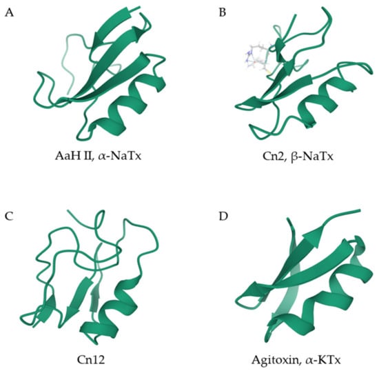 Ribbon diagrams of the 3D structure of selected scorpion venom peptides containing the cysteine-stabilized (CS) α/β motif. (A) AaHII from Androctonus australis is a classical α-NaTx. (B) Cn2 from Centruroides noxius venom is a classical β-NaTx. (C) Cn12, also from C. noxius venom, shows structural resemblance to β-NaTxs, but exhibits an α-NaTx function. (D) Agitoxin 1 from Leiurus hebraeus (previously L. quinquestriatus hebraeus) is an α-KTx toxin. The Protein Database accession numbers are 1PTX for AhHII; 1CN2 for Cn2, 1PE4 for Cn12, and 1AGT for agitoxin 1. KTx: potassium channel toxins, NaTx: sodium channel toxins.