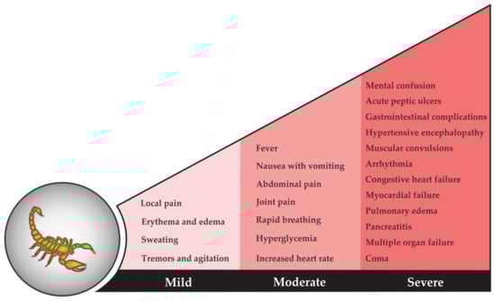 Scorpion envenomings can cause severe pathological effects and even death in humans. The intensity of an envenoming usually depends on the victim’s sensitivity and body mass, the anatomical location of the sting, the amount of injected venom, and the scorpion species. Commonly, based on the severity of symptoms, scorpion envenomings are classified into three levels: mild, moderate, and severe (Figure 2) [,]. Mild envenomings result in local inflammatory reactions, whereas moderate and severe envenomings may provoke lethal systemic responses.