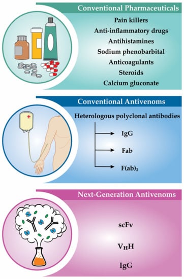 Generally, the first treatment strategies that are undertaken after an envenoming event focus on pain relief and possibly intravenous hydration to decrease the negative effects of strong salivation and sweating. In order to relieve acute pain after a scorpion sting, either cooling by ice or intravenous injection of paracetamol or nonsteroidal anti-inflammatory drugs, such as diclofenac and indomethacin, or topical administration of lidocaine cream at the site of the sting can be used []. However, it is not surprising that the analgesic effect of lidocaine might be superior to the former treatments []. Further substances that are considered for application in envenoming cases are prazosin (which counteracts catecholamine-induced hypertension) [], antihistamines and steroids (which reduce inflammatory responses) [], sodium phenobarbital (which prevents convulsions and lung edema) [,], and calcium gluconate (which eases muscle spasms) []. While partially being used in practice, there does not seem to be a general consensus on the efficacy and possible adverse effects of these treatment options. Yet, in the case of prazosin, it has been shown that the mortality and the mean residence time in the hospital could be significantly reduced by the administration of two doses of the drug, one immediate and one three hours after the envenoming incident []. Additionally, small molecules, such as heparin, ethylenediaminetetraacetic acid EDTA, and aristolochic acid have been shown to neutralize scorpion venom enzymes, such as hyaluronidases, phospholipases A2, and metalloproteases. Thus, these molecules might be considered as a starting point for the development of future treatments []. In more severe envenoming cases, antivenoms are employed to neutralize the venom and diminish the morbidity and mortality of scorpion stings (Figure 3).